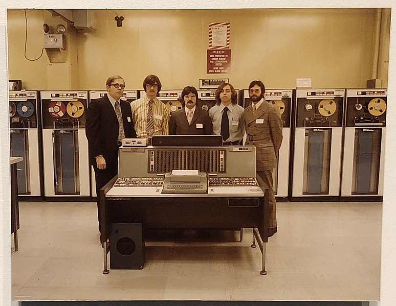 “The photograph shows a group of men standing in what appears to be a 1970s-era computer room. In the foreground is a large piece of computer hardware, possibly a mainframe console, with various knobs, buttons, and displays. The background features several large cabinets, likely containing tape drives, characteristic of computer systems from that era. The walls are a muted yellowish color, and there's a sign visible on the wall, indicating safety procedures or warnings. The floor is a light-colored tile, typical of institutional settings.